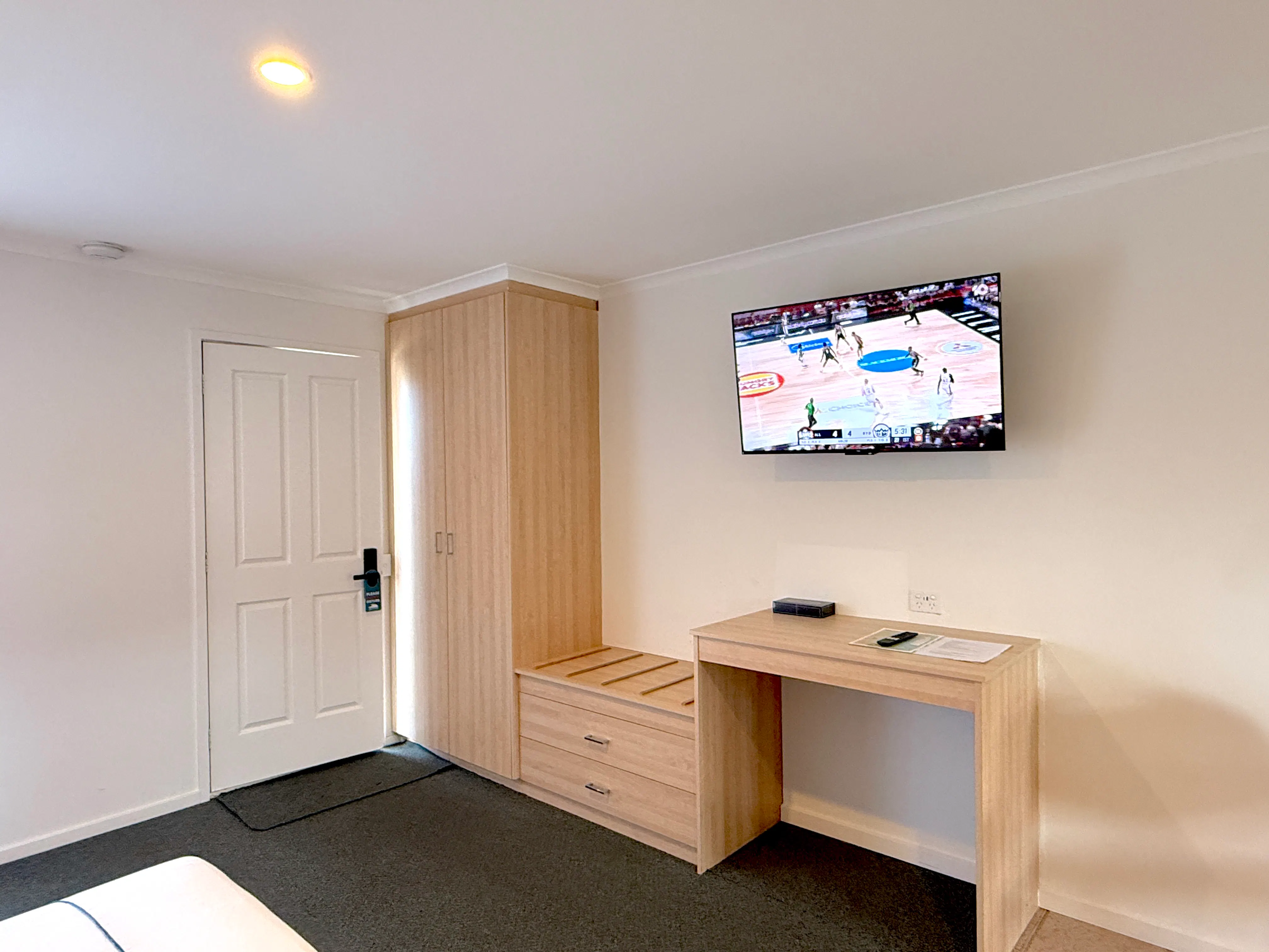 Twin Motel room with double size bed and single bed in the same room including TV, table & chairs, heating, ceiling fan, small fridge, toaster, kettle, tea & coffee plus small ensuite bathroom with shower, toilet, hand basin & hair dryer. Ideal for short or longer stays. Ground Floor, Max 3 persons including children.